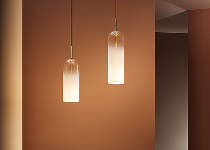 When the light is switched on, the filigree lightness is further emphasised, while the glass captures the light inside, making the KHOI a unique lighting object.