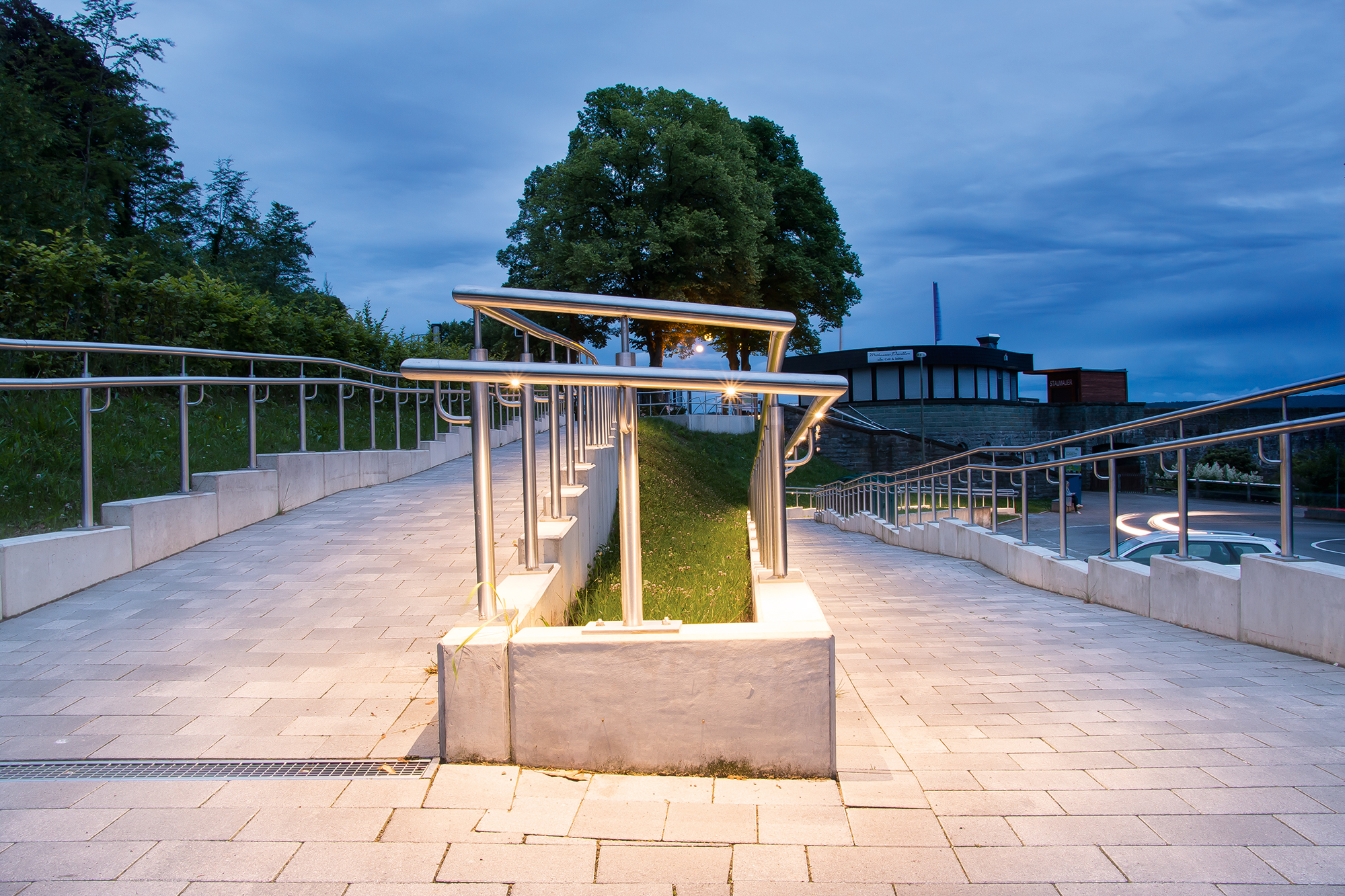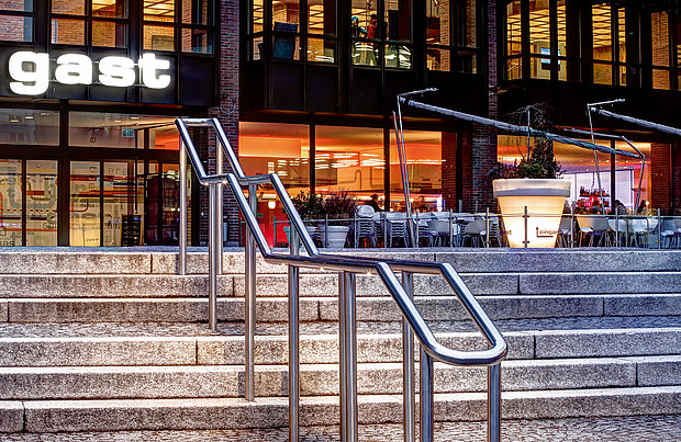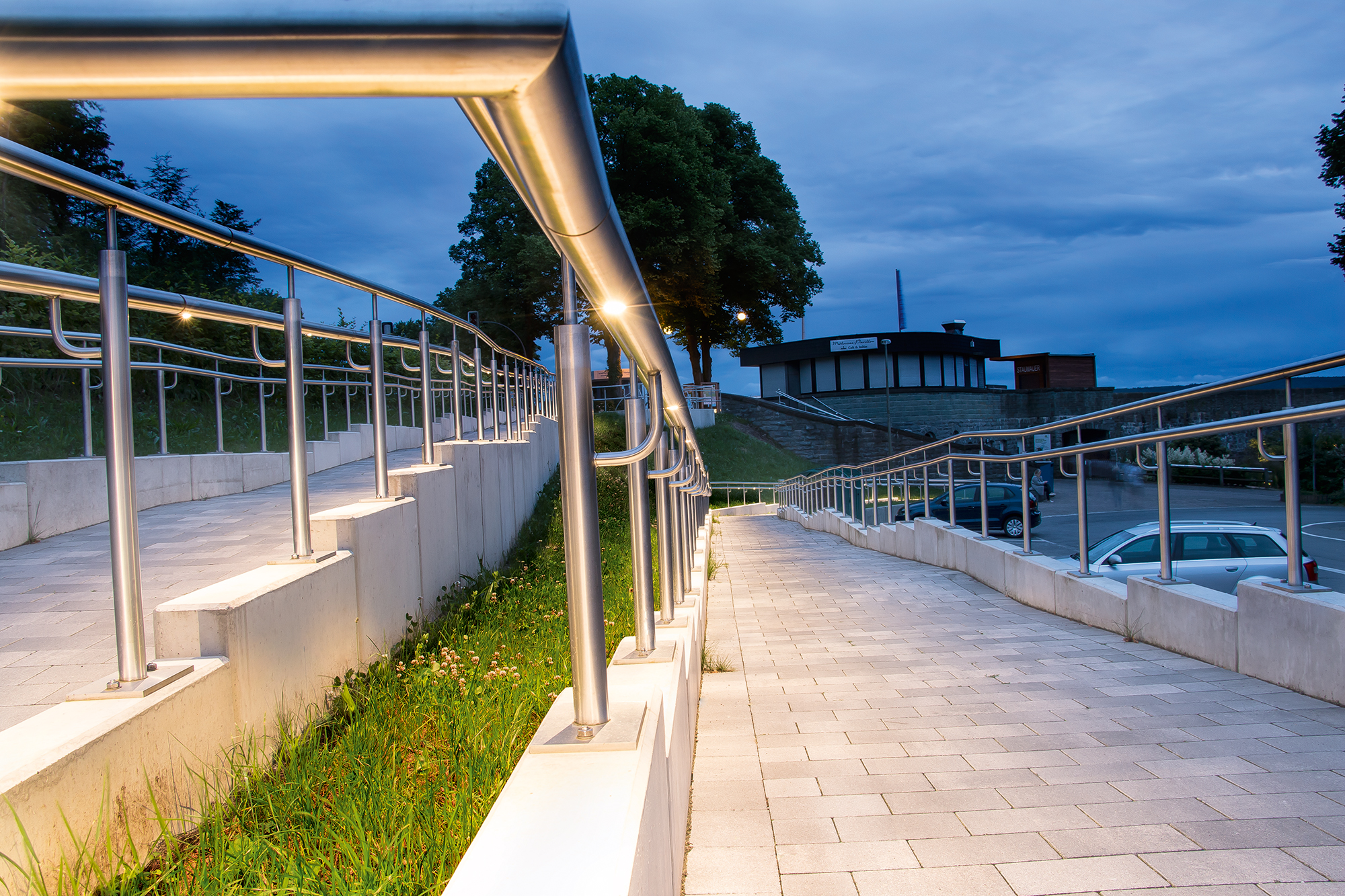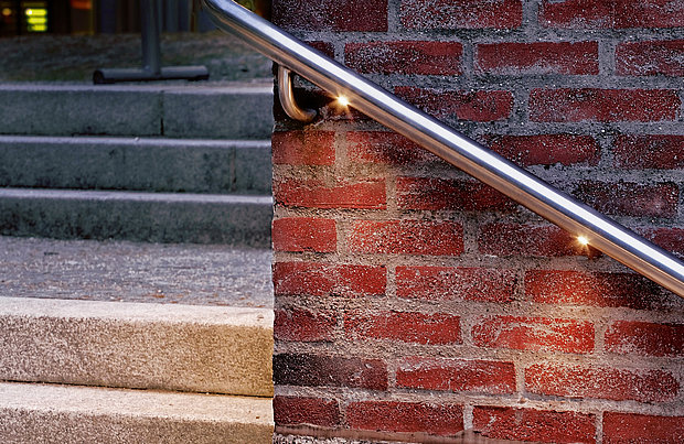 For the numerous stairways the LED PUCK system, which was specifically developed for flush integration into metal handrails, ensures safety-focused illumination of the stairs. Furthermore, the small yet efficient light sources (1.6 W), which have a service life of some 50,000 hours, provide atmospheric lighting for the neighbouring masonry with warm white light of 3,000 Kelvin.