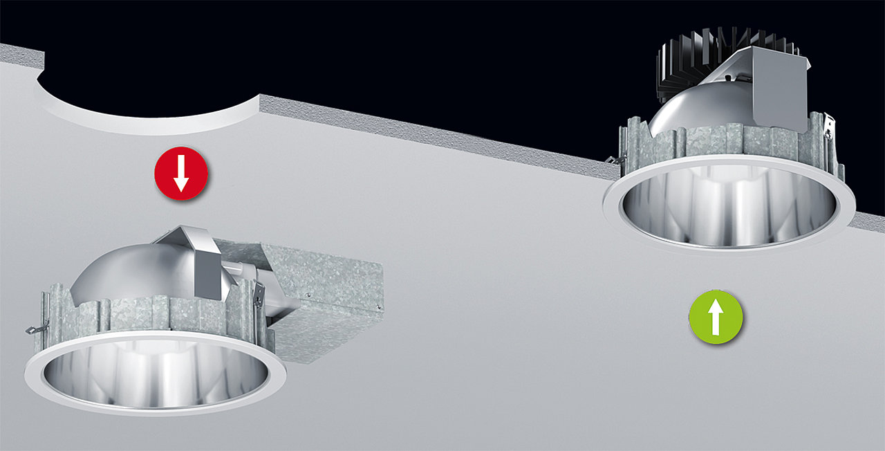 LED-Downlights von heute sind kompakter als damalige Downlights, dies kann bei Sanierungen oder in denkmalgeschützten Gebäuden ein Problem sein. Genau hierfür bieten wir modernste LED-Downlights, die ohne Mehraufwand in die damaligen Deckenausschnitte mit 240 mm (R23) und 280 mm (R27) passen.