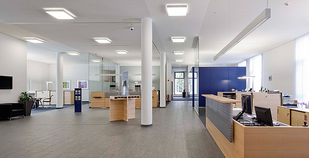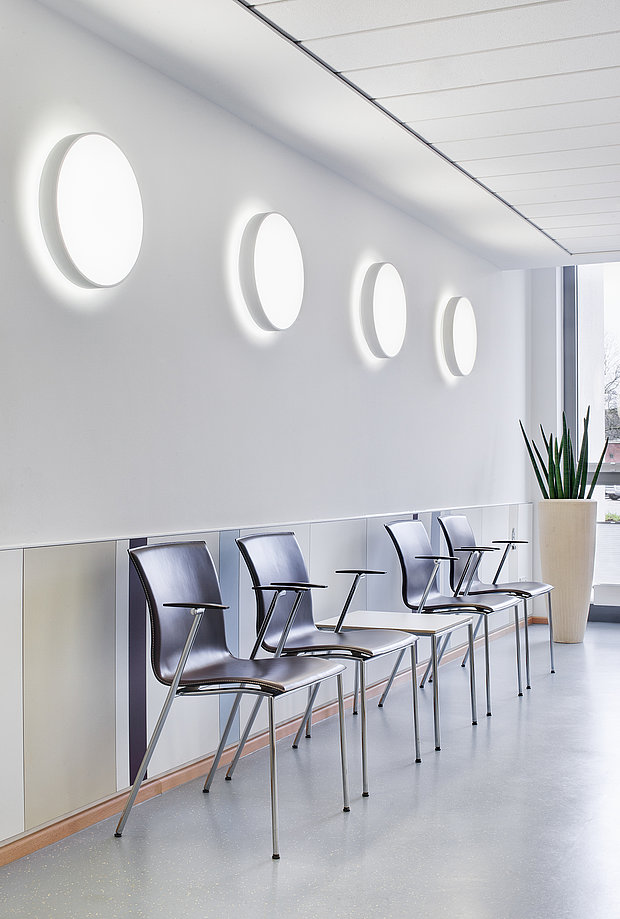 Für einen lebendigen Raumeindruck sorgen CLEAR Deckenleuchten, die mit ihrer direkten/indirekten Lichtverteilung die großzügige Empfangshalle illuminieren. Der MIX aus DIREKTEN und INDIREKTEN LICHTANTEILEN sorgt zusätzlich für eine Akzentuierung der Decke oder Wand, wodurch der Raum optisch an Größe gewinnt.