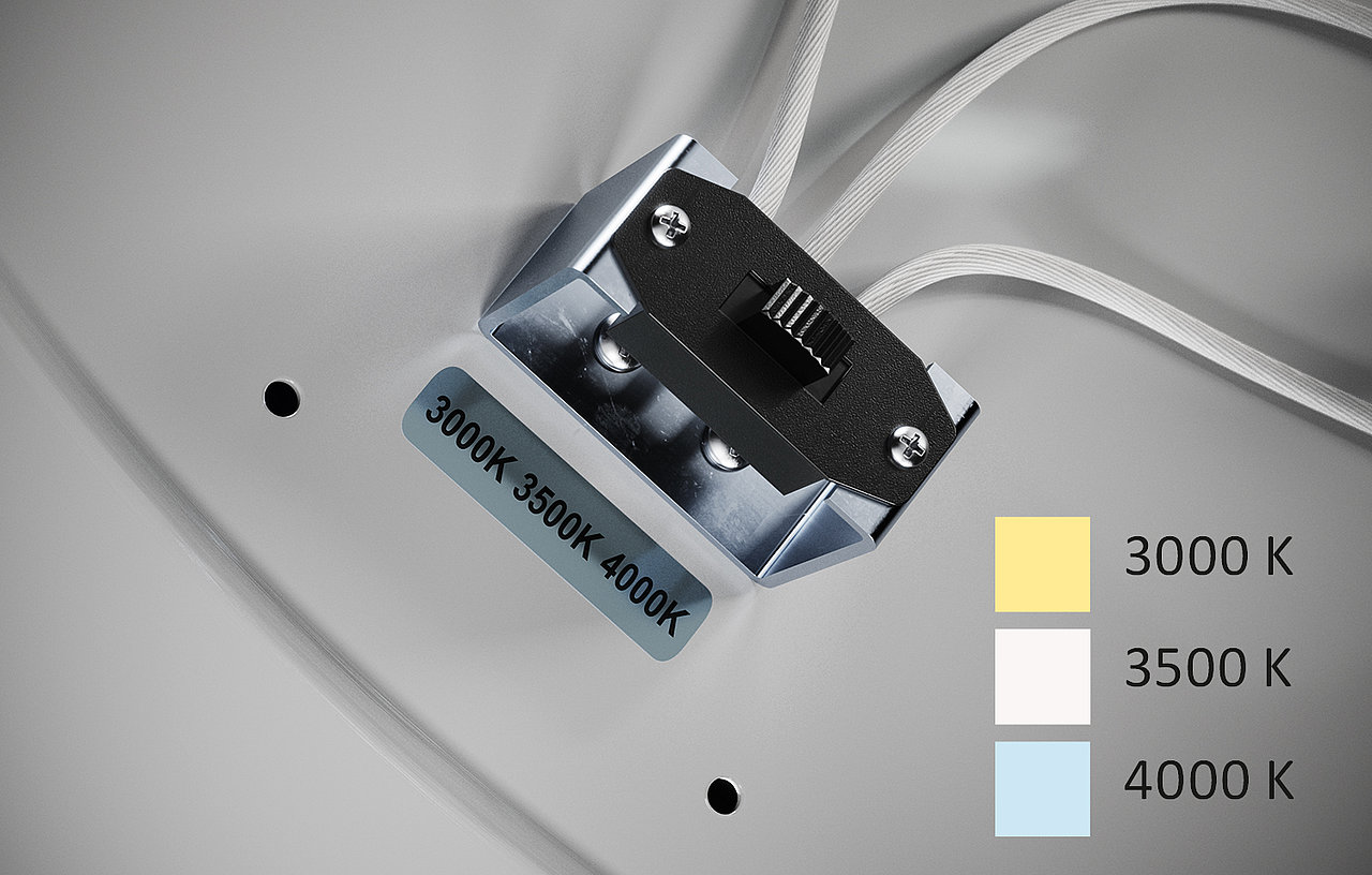 Eine Lichtfarbe pro Leuchte ist Ihnen zu langweilig? Uns auch. Deshalb hat die CLEAR EVO als erste Leuchte in unserem Portfolio einen CCT-Switch, mit dem Sie ganz einfach zwischen 3000, 3500 und 4000 Kelvin umstellen können. So bekommen Sie drei Lichtstimmungen mit nur einer Leuchte.
