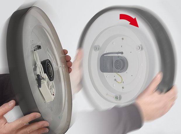 Erhältlich als Wand-, Decken- oder Pendelleuchte in zwei Größen (380 und 600 mm) und drei Lichtfarben (2700, 3000 und 3500 K) über einen CCT-Switch.