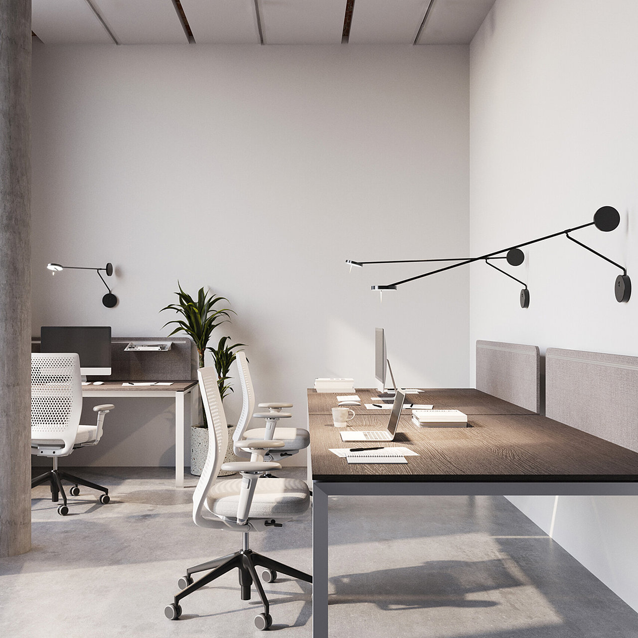 Die unterschiedlichen Arm- und Lampenkopfpositionen ermöglichen viele verschiedene Anordnungen, die die Lampe fast wie schwebend wirken lassen und an ein Mobile erinnern.