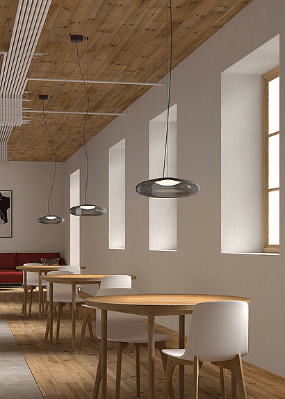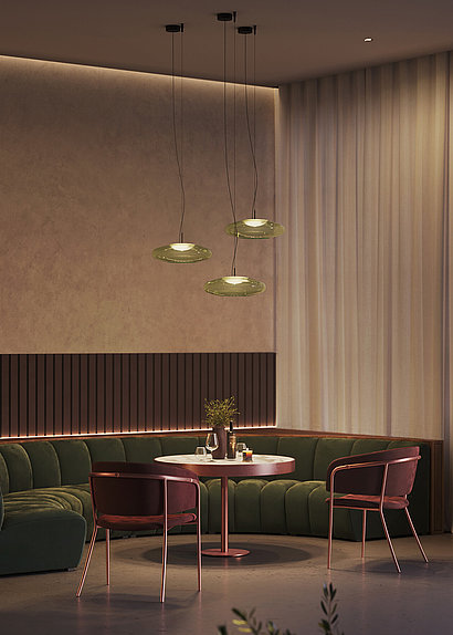 Bei eingeschaltetem Licht wird die filigrane Leichtigkeit noch verstärkt, während das Glas das Licht im Inneren einfängt und die KHOI damit zu einem einzigartigen Lichtobjekt macht.