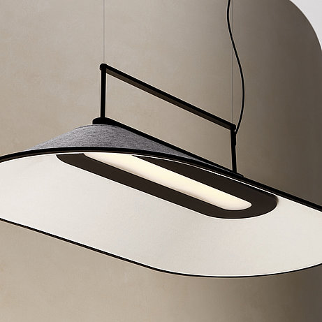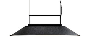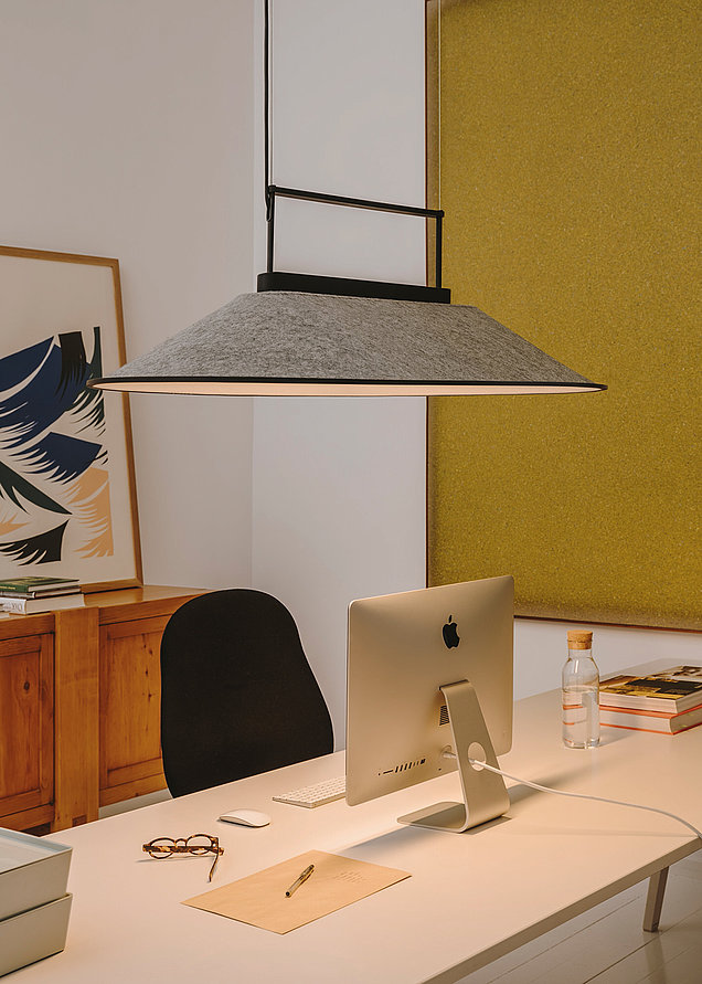 Der Lampenschirm aus recyceltem Filz verleiht dem Raum Wärme und bietet gleichzeitig Schalldämmung.