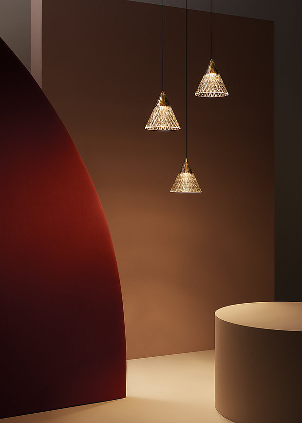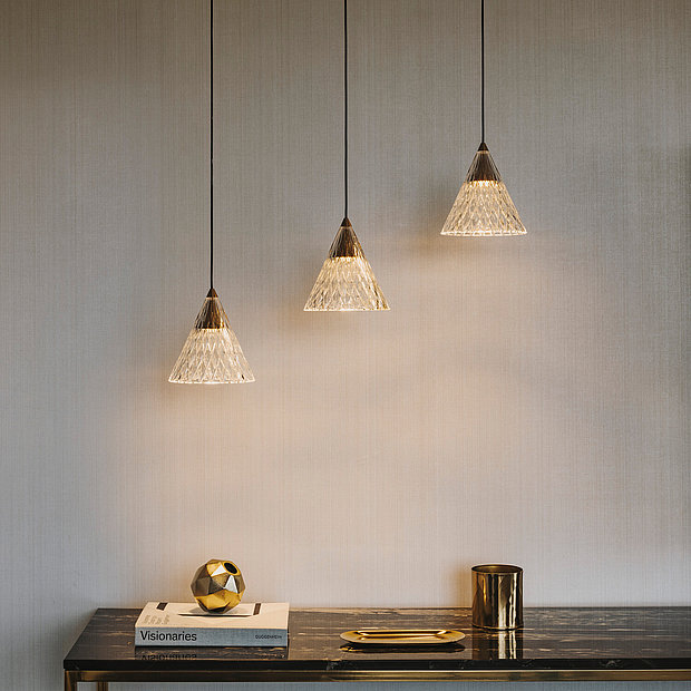 Für die Decke als Pendelversion oder als Wandleuchte. Die Kollektion ist als Einzelleuchte oder Mehrfachleuchte erhältlich.