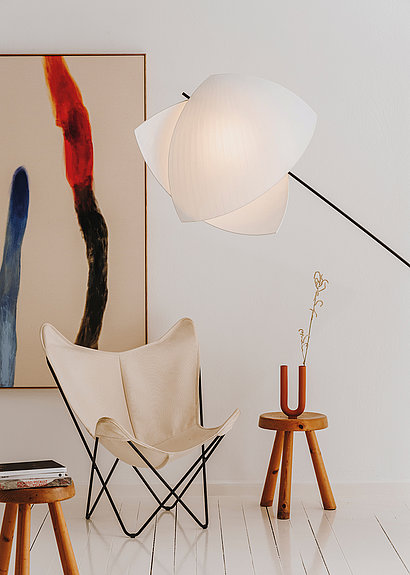 Einerseits eröffnet die asymmetrische Form dem Betrachter je nach Blickwinkel verschiedene Sichtweisen. Andererseits verleiht das Japanpapier dem Werk eine Leichtigkeit und permanente Beweglichkeit. So entsteht ein poetisches Werk, das jeden Raum mit seiner Lebendigkeit verschönert.