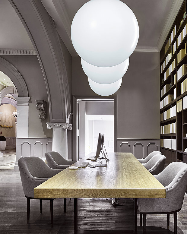 Die leuchtende Kugel übernimmt die Funktion der Allgemeinbeleuchtung in Verkaufsräumen, Hallen, Foyers und Passagen. Die moderne Pendelleuchte PEARL kombiniert HOCHWERTIGE MATERIALITÄT und VERARBEITUNG.