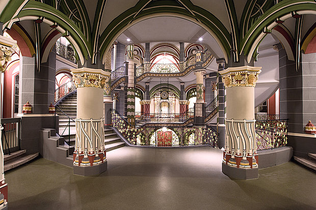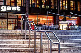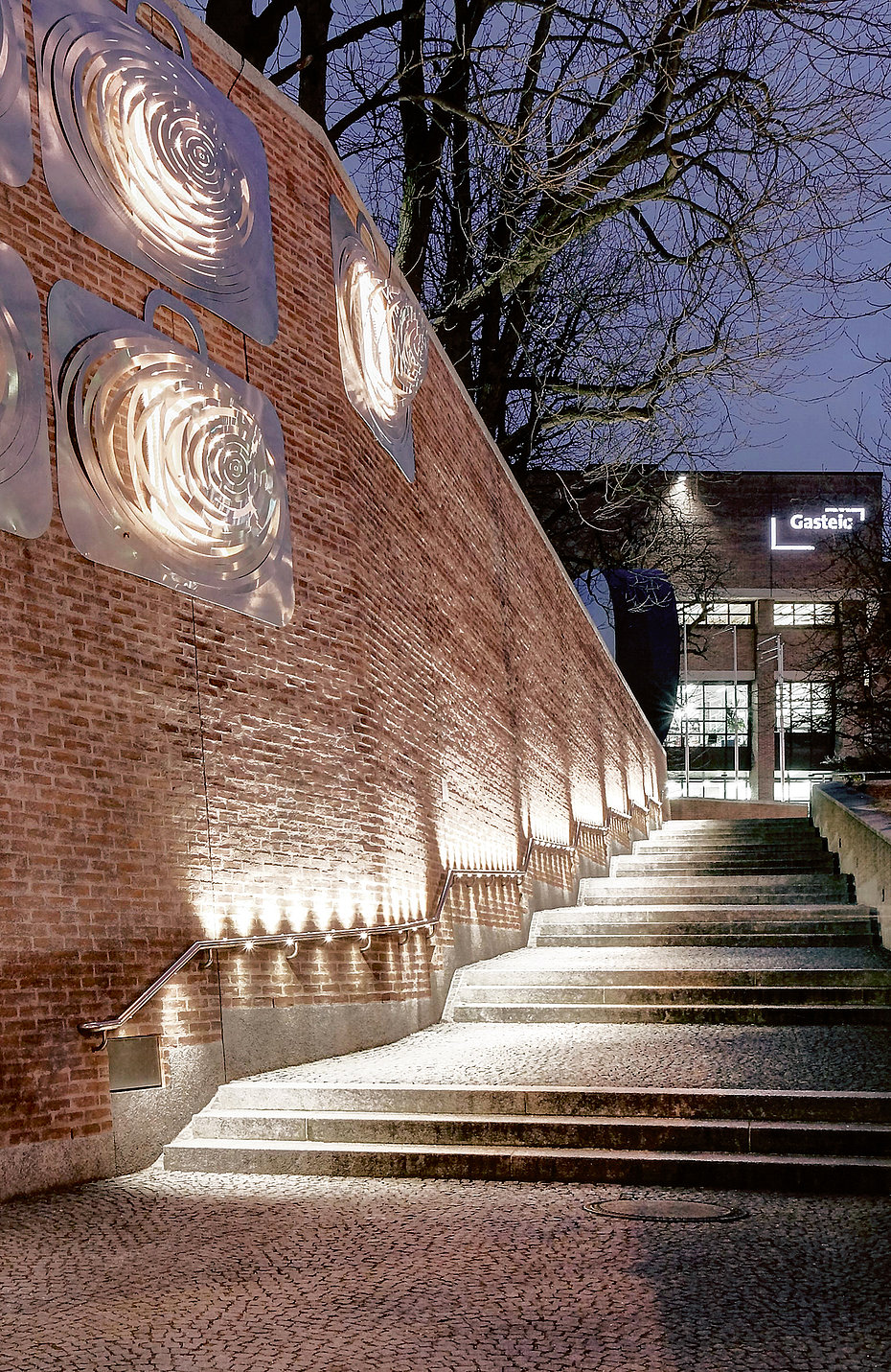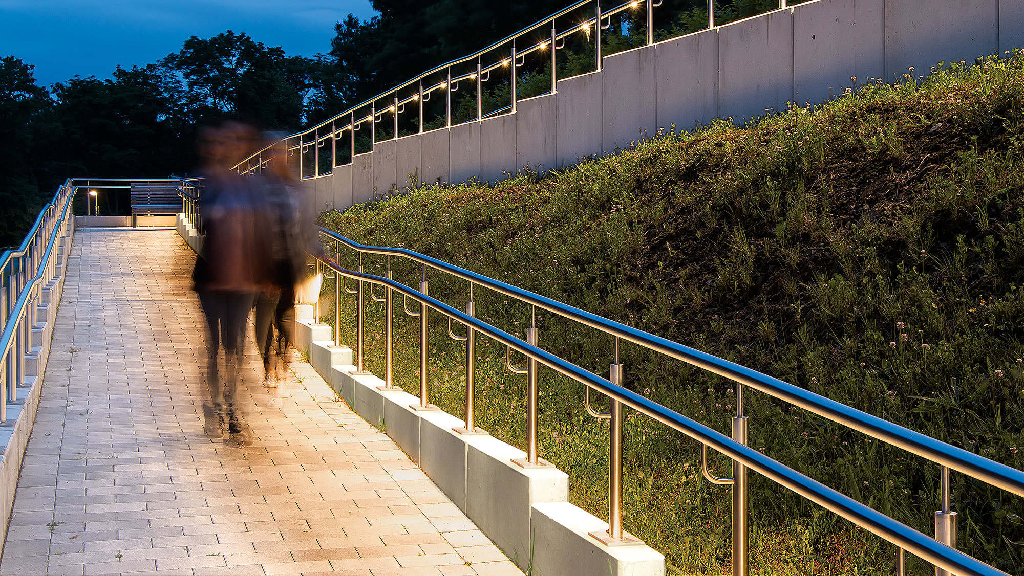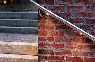 Bei den zahlreichen Treppenaufgängen überzeugt das speziell für den bündigen Einbau in metallene Handlaufprofile entwickelte LED PUCK System für eine sicherheitsrelevante Ausleuchtung der Stufen. Außerdem erhellen die kleinen, effizienten Leuchtmittel (1,6 W), die eine Lebensdauer von etwa 50.000 Stunden haben, mit dem Warmton 3.000 Kelvin atmosphärisch das angrenzende Mauerwerk.