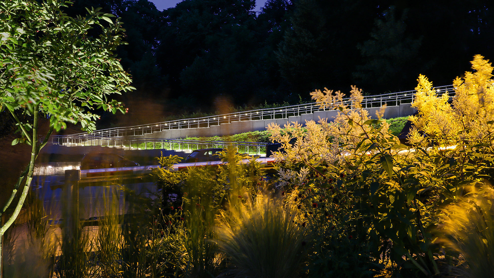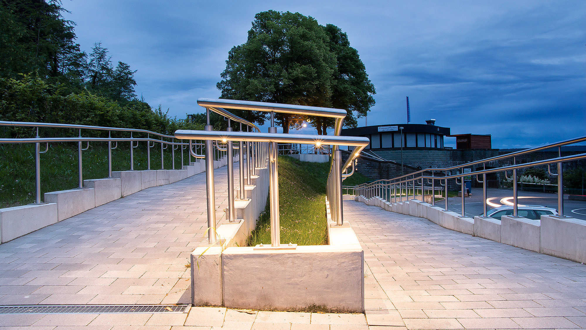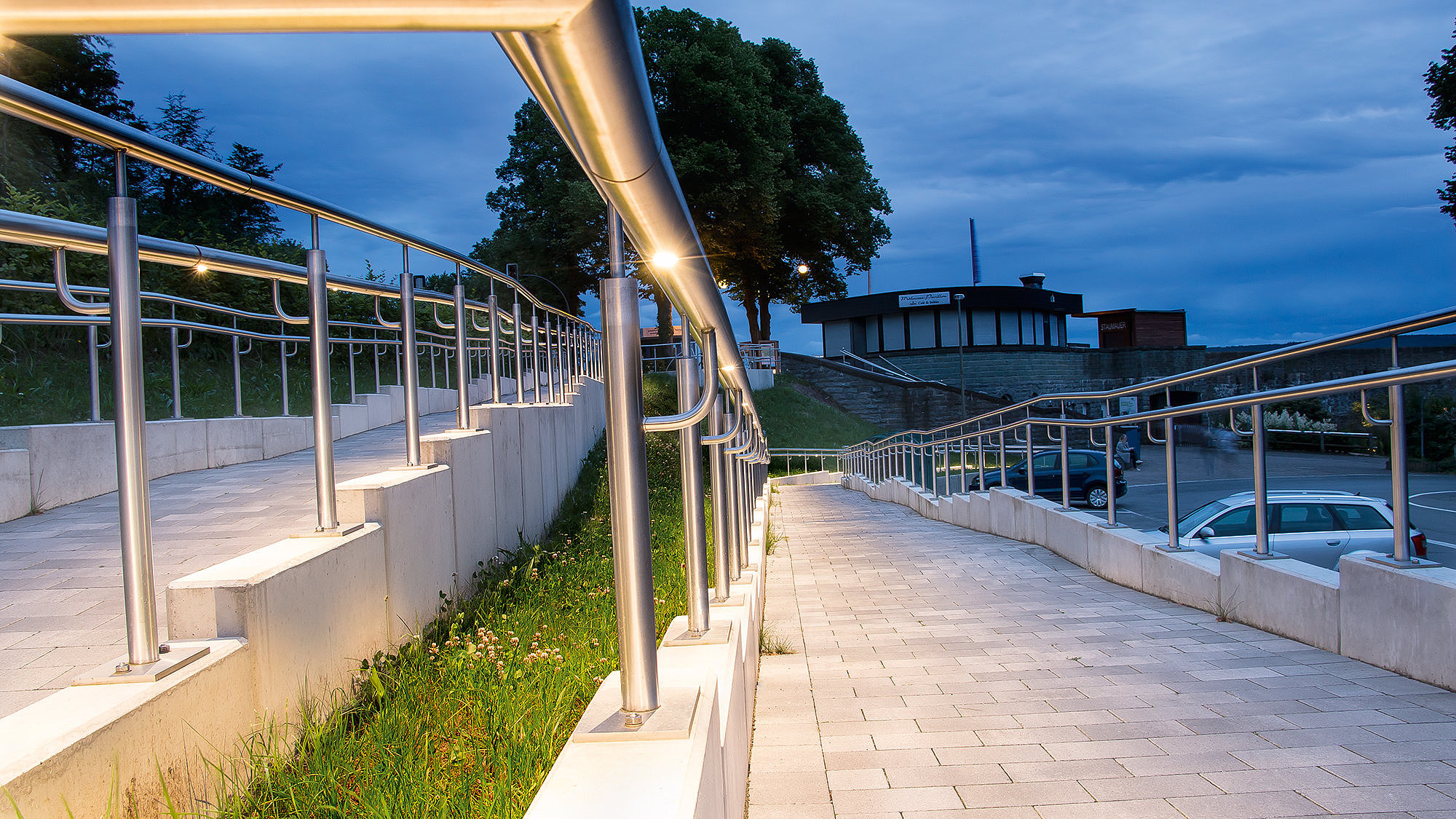 ABENDS sorgt das Licht der kleinen LED-Spots (1,5 W) für eine NORMGERECHTE AUSLEUCHTUNG des behindertengerecht gestalteten Aufgangs