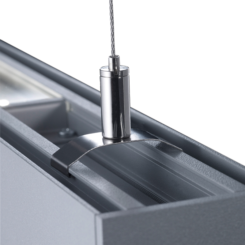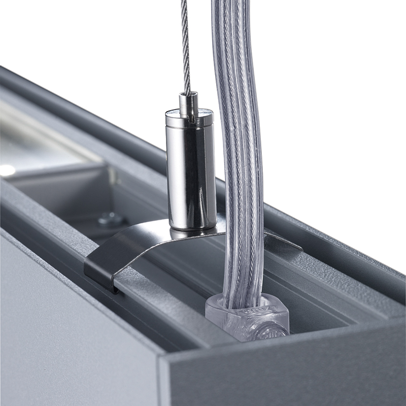 Die Aufhängung wird werkzeuglos mit Clips am Leuchtenkörper befestigt, diese können stufenlos verschoben werden, analog zu den Aufhängepunkten an der Decke.