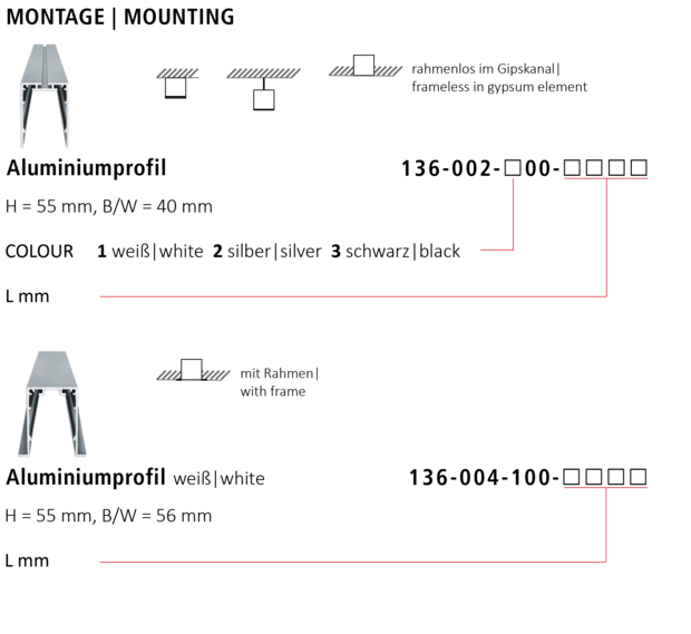 - Aluminiumprofile silbergrau, schwarz oder weiß (auch als 90°-Winkel)