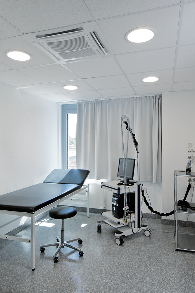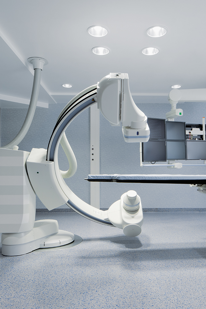 Im Herzkatheterlabor des Cardioangiologischen Centrum Bethanien im Markus Krankenhaus in Frankfurt sorgen Hochleistungs-LED-Downlights für eine normgerechte und homogene Allgemeinbeleuchtung bei geringem Energieeinsatz sowie ein ruhiges Deckenbild. Die TENTEC ZONO Downlights haben einen Durchmesser von nur 25 Zentimetern bei dennoch hoher Lichtausbeute.
