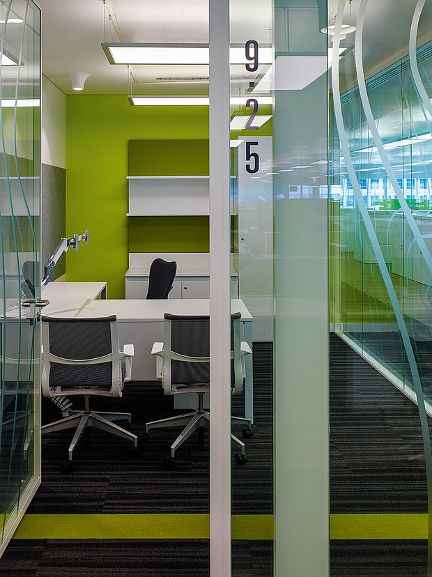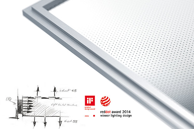 Die integrierte LIGHT CONTROL STRUCTURE (LCS) bricht das Licht an exakt vorher berechneten Stellen und lenkt es BLENDFREI in den Raum, dies ermöglicht die RICHTUNGSNEUTRALE LEUCHTENANORDNUNG bei NORMGERECHTER BLENDUNGSBEGRENZUNG < 3000 cd/m2.