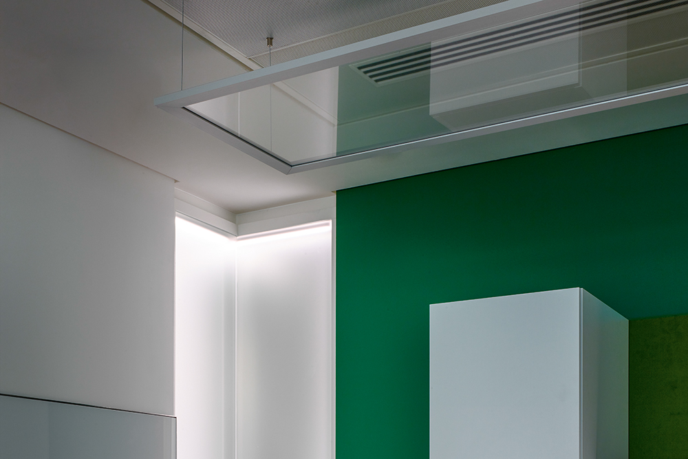 Die TRANSPARENZ des MATERIALS erlaubt eine Architektur des Lichts und der Transparenz. Dadurch, dass die Leuchte die Architektursprache nicht überlagert, behalten Räume ihre ursprünglich geplante Eigenständigkeit. Im eingeschalteten Zustand kann der Raum bewusst neu interpretiert werden.