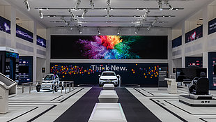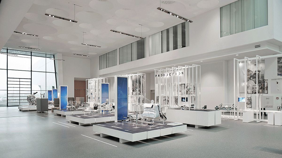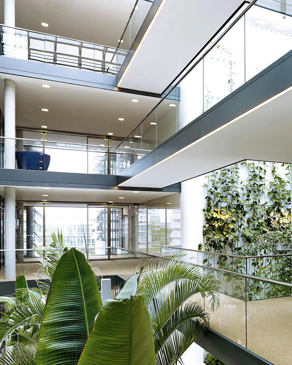 Unterschiedlich große CLEAR Deckenleuchten mit einem Mix aus direkten und indirekten Lichtanteilen setzen spannende Akzente und leuchten das Atrium homogen aus.
