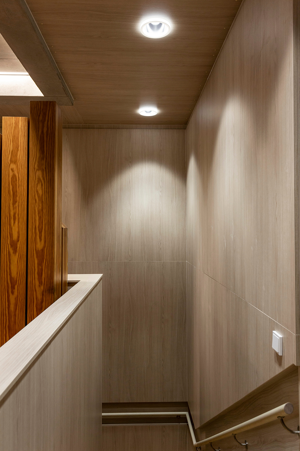 In der im Untergeschoss befindlichen 410 m² großen Sporthalle kommen speziell entwickelte ballwurfgeschützte TENTEC Downlights zum Einsatz. Dank der guten Ausleuchtung ist der Ball immer perfekt zu sehen; und durch die verschraubte Schutzscheibe aus dickwandigem PMMA die LED perfekt geschützt.