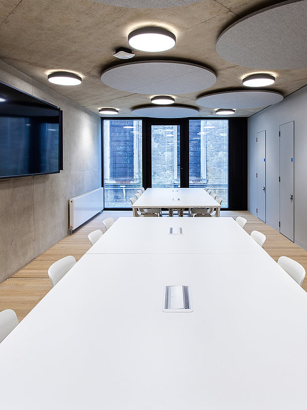 Ein Ergebnis sind LED-Pendelleuchten mit einem Durchmesser von maximal 650 mm. Der Lichtstrom beträgt hierbei 3675 Llm bei einer Farbtemperatur von 4000 K und erreicht 112 Llm pro Watt. Das Ringgehäuse ist aus einem Stahlprofil gefertigt und in Graualuminium RAL 9007 lackiert. Maßgefertigte Rohrpendel und der schlichte Baldachin mit integriertem DALI-Betriebsgerät garantieren eine einfache Installation und Wartung.