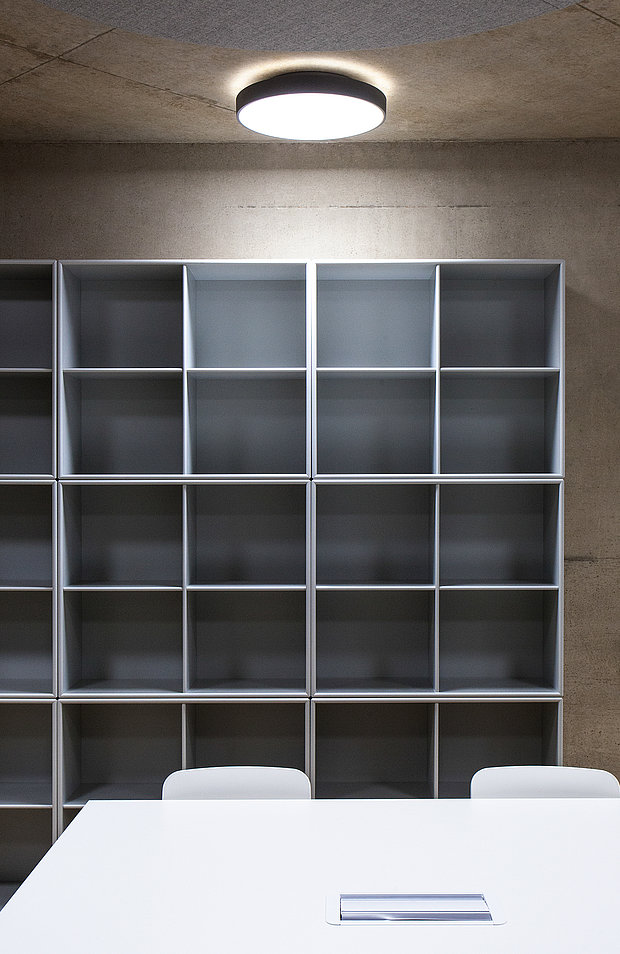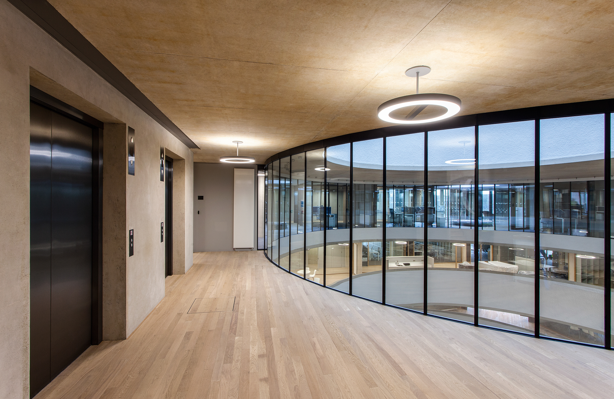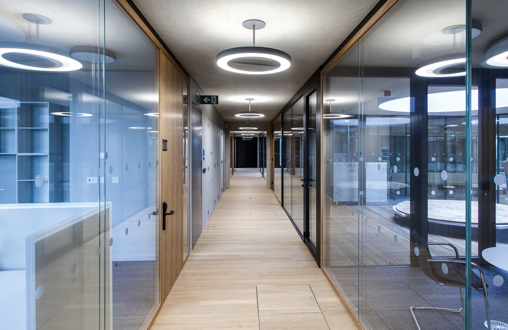 In den oberen Etagen befinden sich die einzelnen Büroflächen. Das Projektteam entschied sich hier für Anbauleuchten mit 90% direkten und 10% indirekten Lichtanteilen für einen lebendigen Raumeindruck.