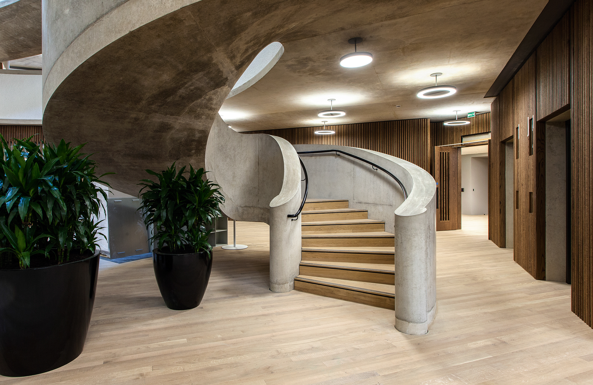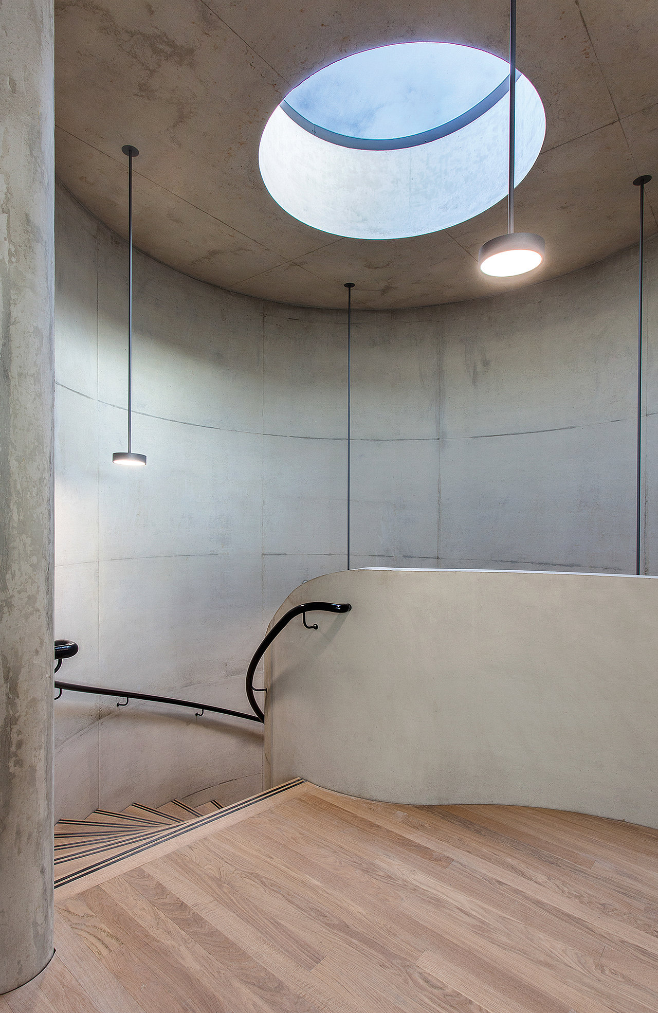 Visuelles Highlight des Neubaus ist die zentrale Wendeltreppe aus poliertem Beton. Direkt/indirekt strahlende Pendelleuchten mit einem Durchmesser von 200 mm folgen präzise dem Treppenverlauf. Nicht nur die sich daraus ergebenden unterschiedlichen Längen der Rohrpendel, sondern auch die exakte Montage an den schrägen Deckenflächen stellte eine Herausforderung dar. Gerade die Übertragung, der lichtplanerischen und architektonischen Vorgaben in das Leuchtenkonzept, war eine spannende Aufgabe.