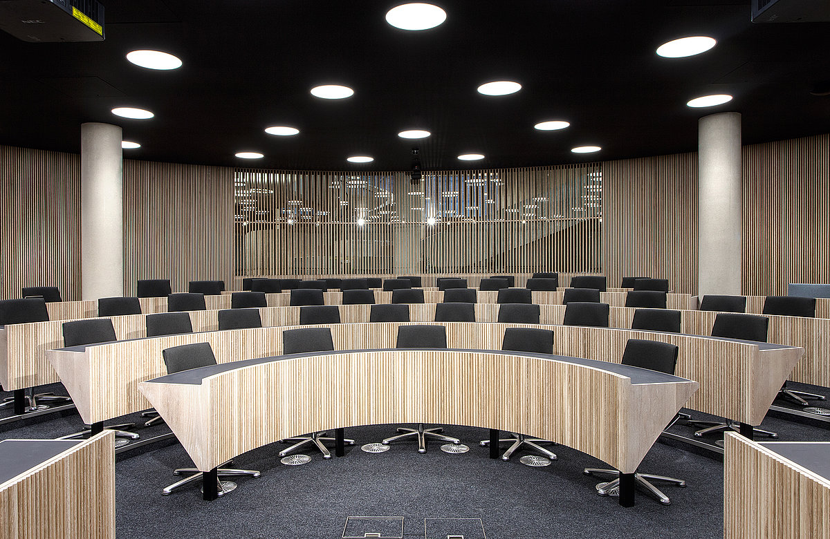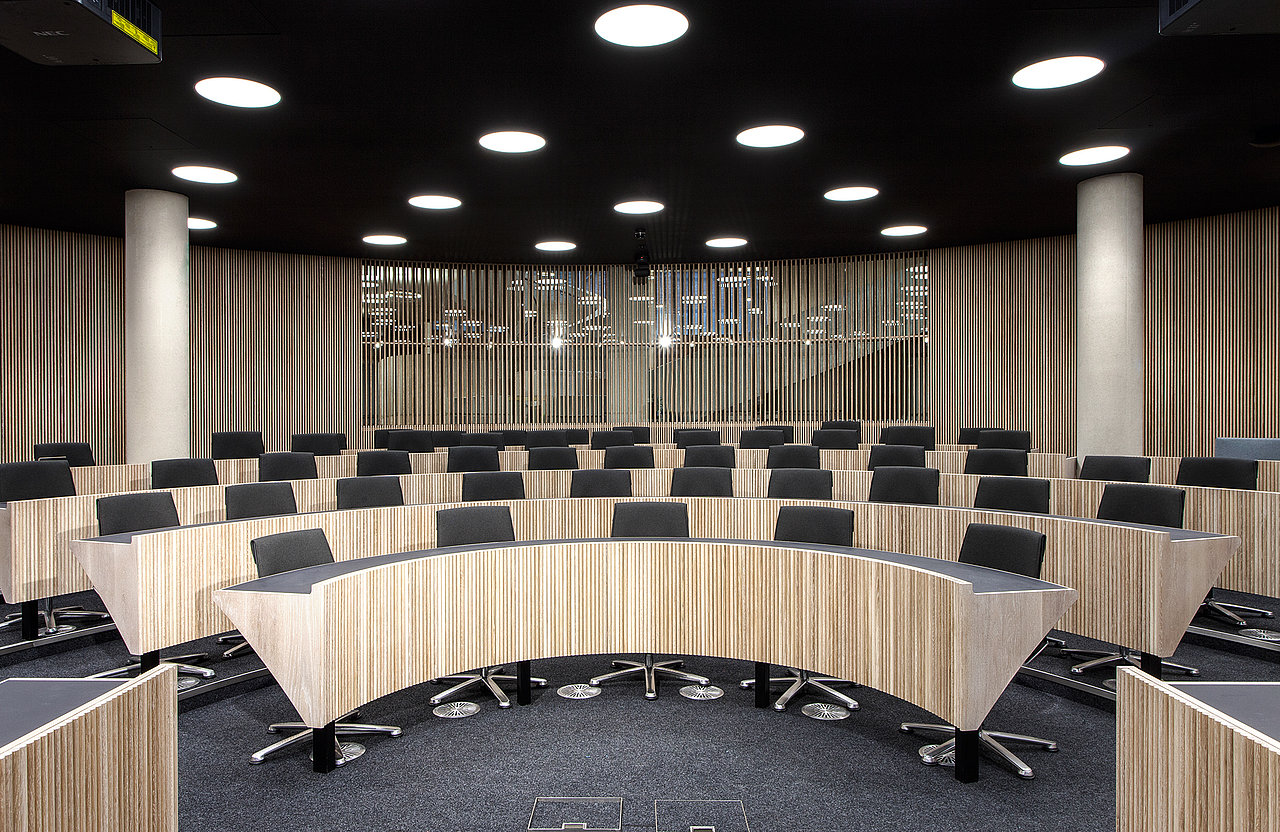 Im Erdgeschoss der Blavatnik School liegen zwei hufeisenförmige Hörsäle. Hier kommen LED-Einbauleuchten mit einem Durchmesser von 450 mm zum Einsatz, durch das hoch effiziente Mikroprismenmaterial wird ein UGR-Wert < 19 erfüllt und störende Blendungen vermieden.