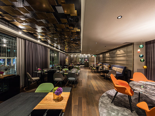 Für das leibliche Wohl sorgen zwei separate Gastronomiebereiche. Mit direktem Blick auf den Boulevard „Unter den Linden“ können die Besucher zwischen neuen Interpretationen der Berliner Stulle oder Kreationen auf hohem Niveau von Executive Küchenchef Philipp Liebisch wählen. Das Beleuchtungskonzept setzt hierbei auf zonale Akzentuierung um die innenarchitektonischen Statements herauszuarbeiten. Prädestiniert hierfür sind die Downlights ALPHABET SPECTRA mit einer exzellenten Farbwiedergabe von Ra > 95 und unterschiedlichen Ausstrahlungswinkel von 20°, 40° und 60°. Für eine gute Raumatmosphäre wurden zusätzlich Akustikdecken eingeplant, ein speziell entwickelter Montagering sorgt hierbei für sicheren Halt im Deckensystem.