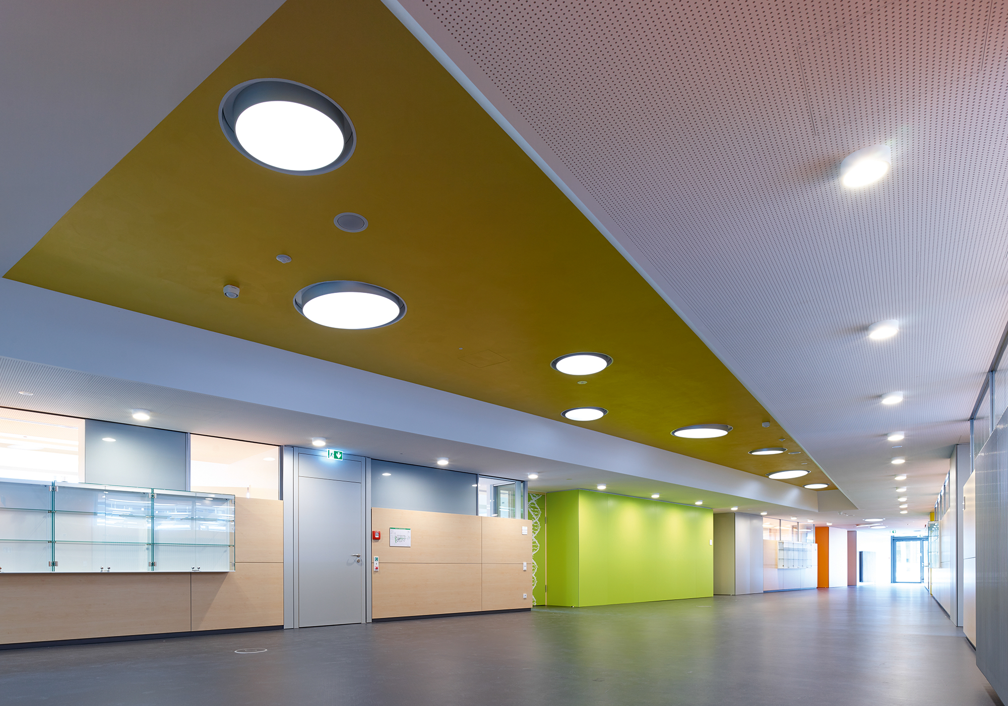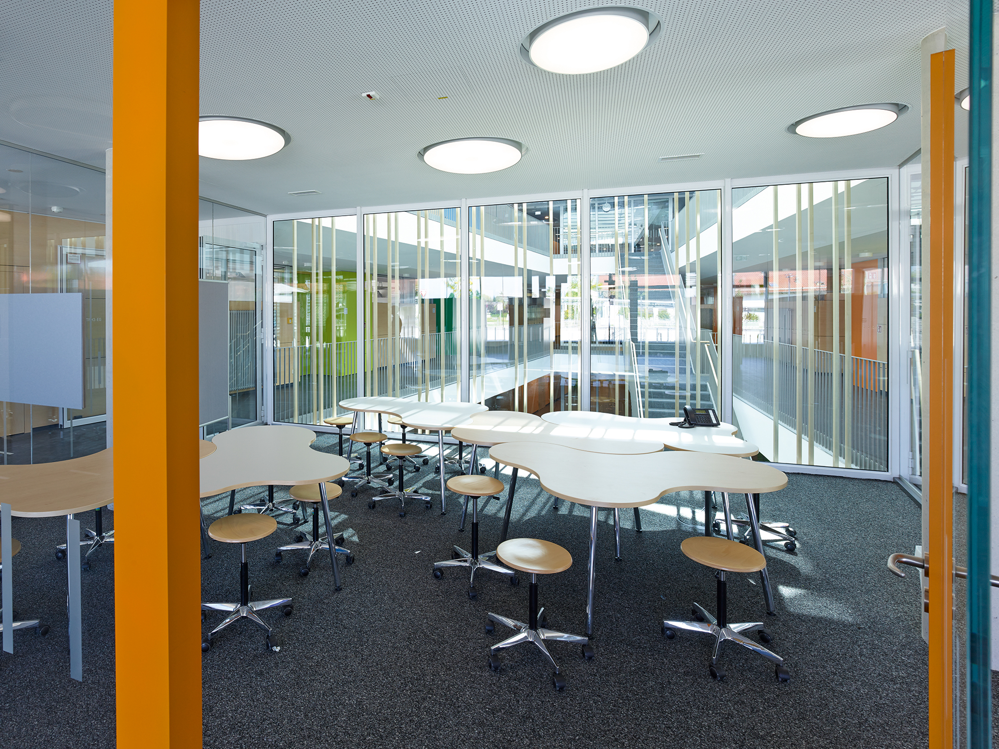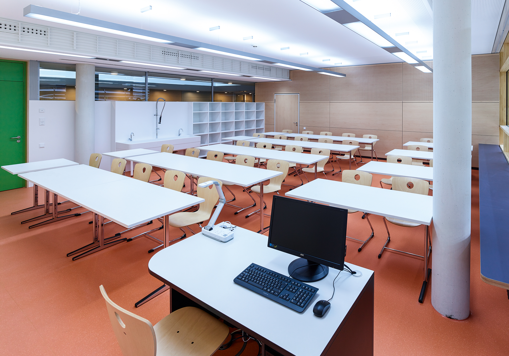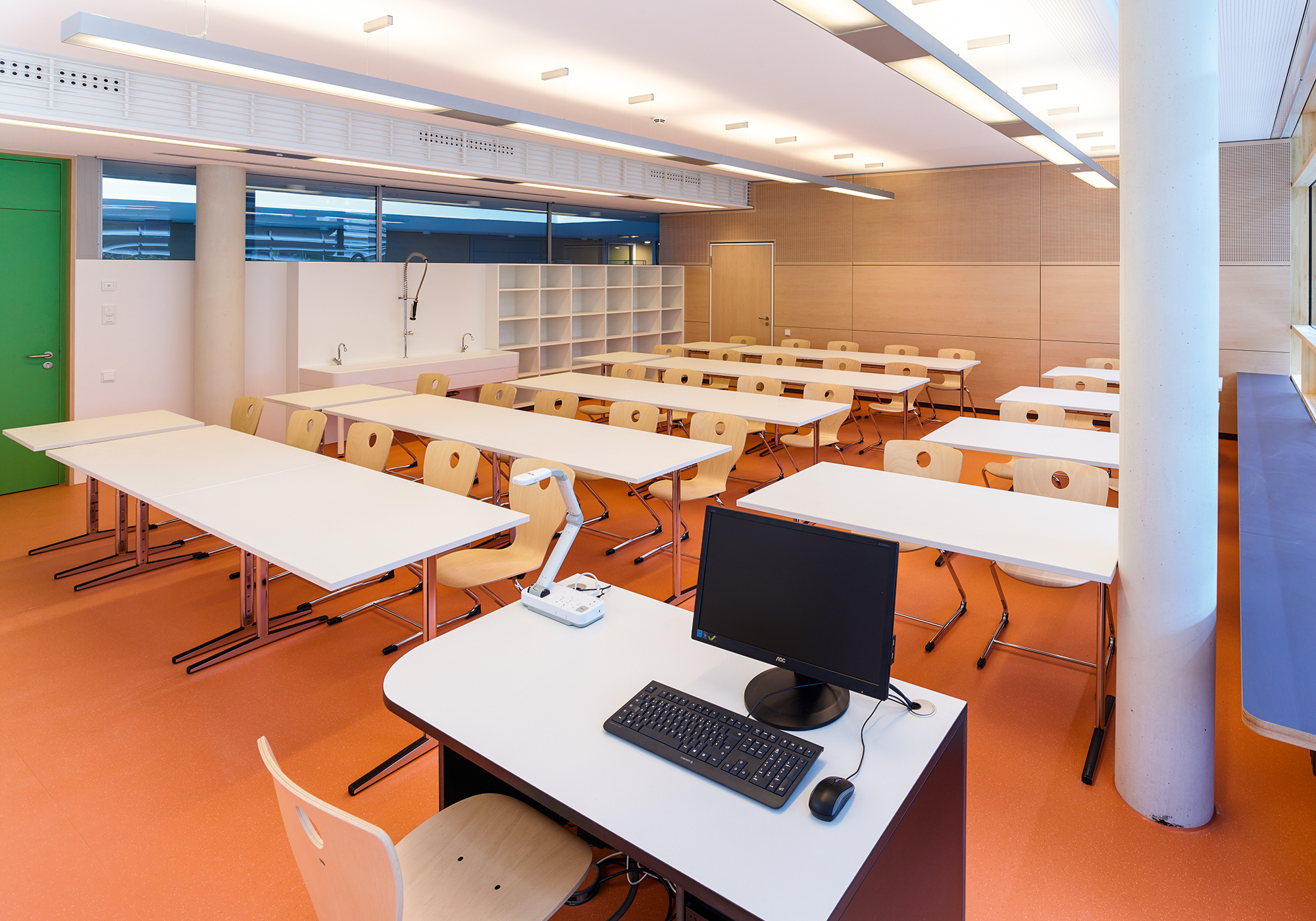 Bei den Klassenzimmern kam ein speziell entwickeltes Lichtbandsystem zum Einsatz. Die Wahl der Lichtfarbe und die Dimmung dieses Systems ermöglicht dabei eine Individualisierung des Lichtes, die sich zudem in vier Lichtszenen abspeichern lässt. So ähnelt eine Lichtszene mit kaltweiß-bläulichem Licht dem Tageslicht, dies fördert die Aktivität und Konzentration; gerade in der dunklen Jahreszeit oder in den frühen Morgenstunden. Im Gegenzug dazu wirkt sich eine Lichtszene mit warmer Lichtfarbe beruhigend aus, durch die Dimmung kann die Beleuchtung unabhängig von der Lichtfarbe den Anforderungen an die Sehaufgabe angepasst werden.