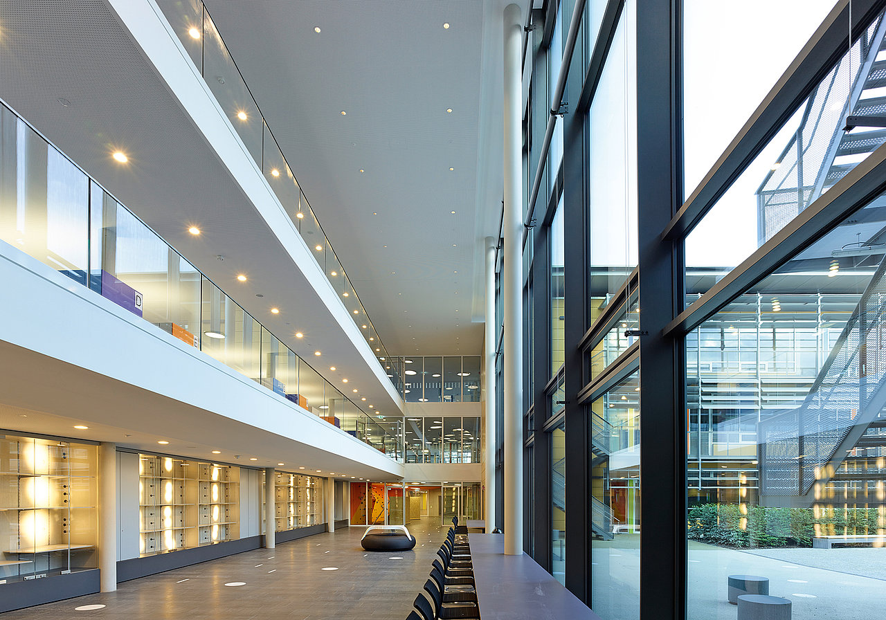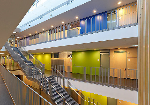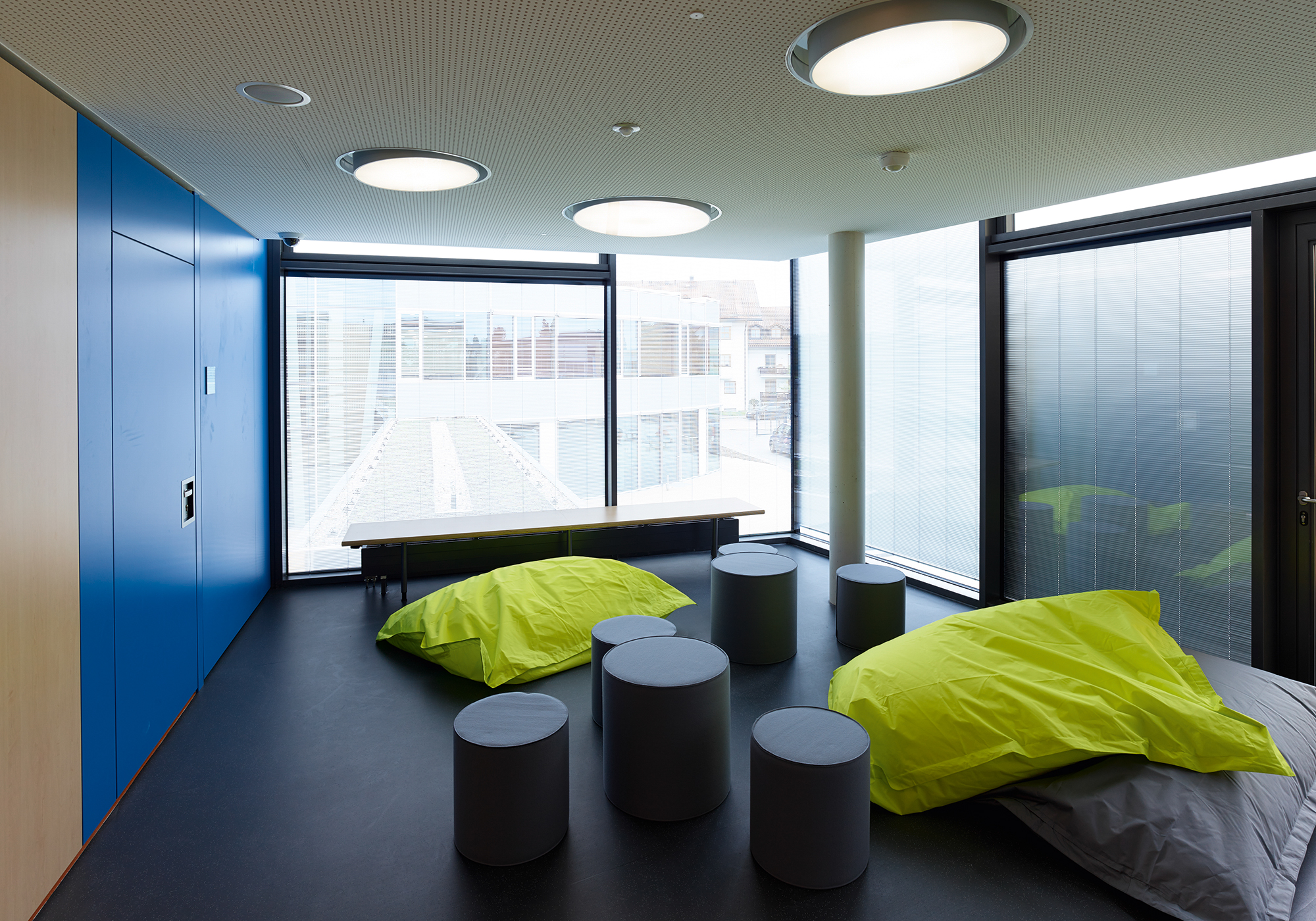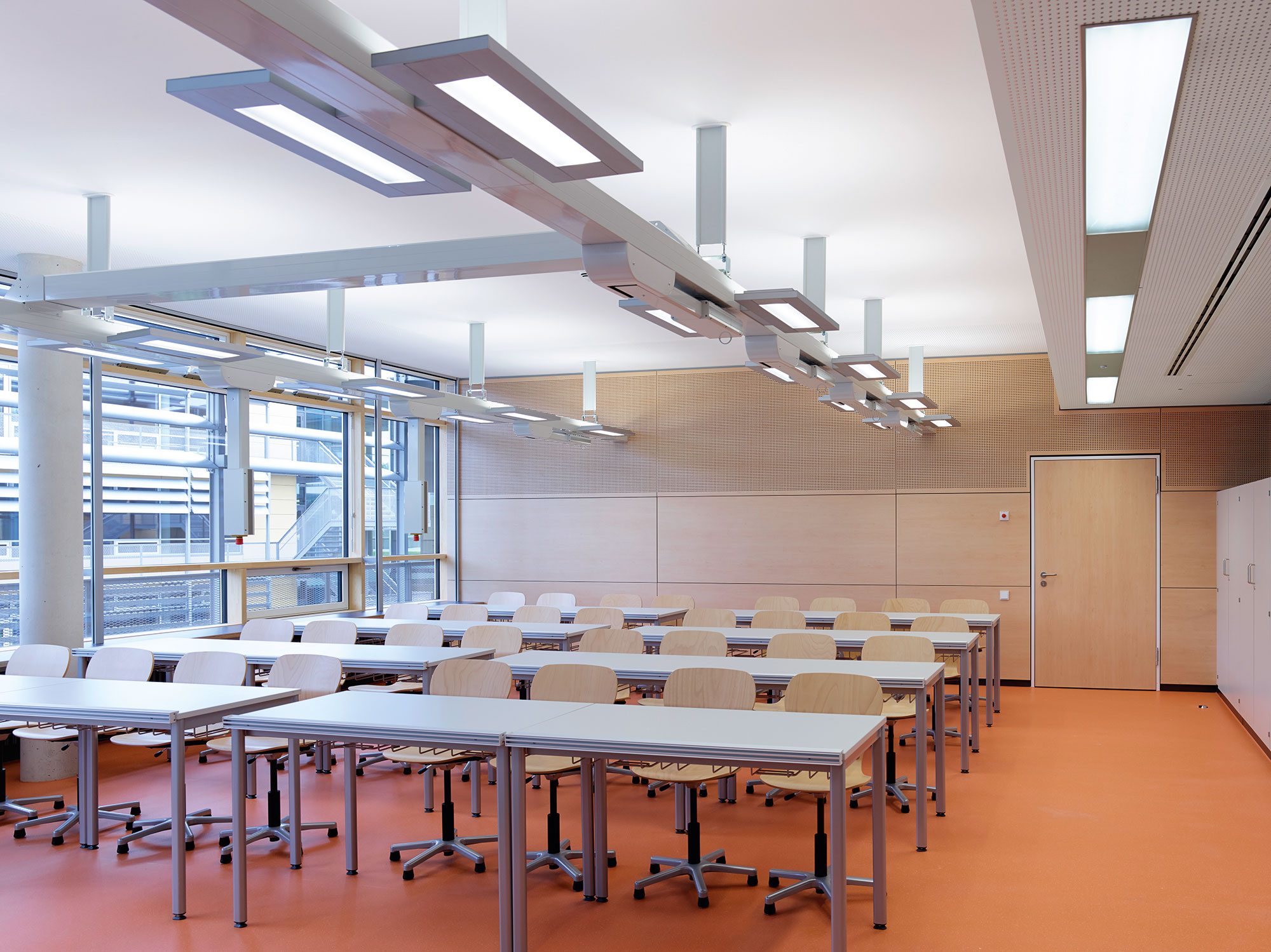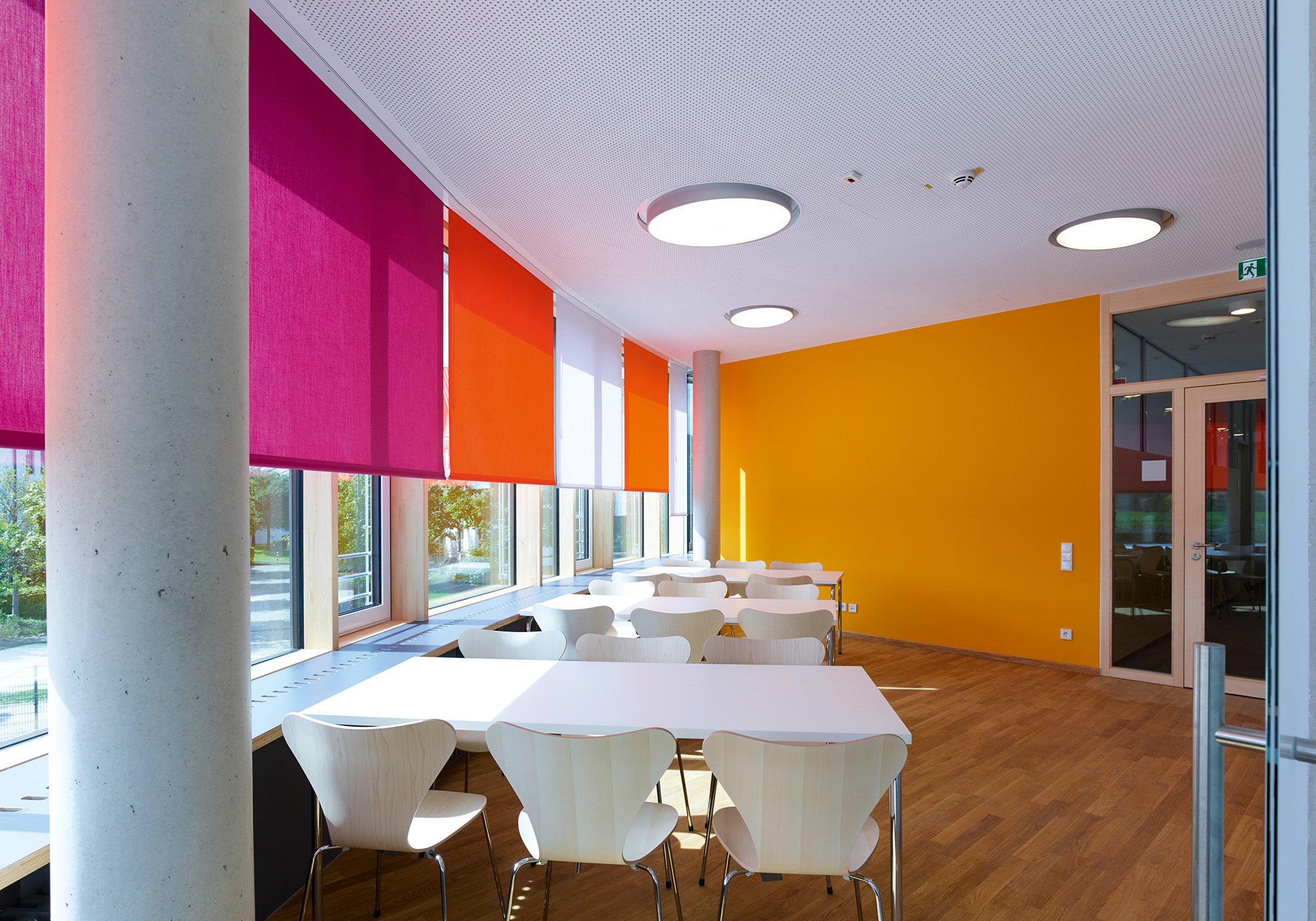 Bei den Klassenzimmern kam ein speziell entwickeltes Lichtbandsystem zum Einsatz. Die Wahl der Lichtfarbe und die Dimmung dieses Systems ermöglicht dabei eine Individualisierung des Lichtes, die sich zudem in vier Lichtszenen abspeichern lässt. So ähnelt eine Lichtszene mit kaltweiß-bläulichem Licht dem Tageslicht, dies fördert die Aktivität und Konzentration; gerade in der dunklen Jahreszeit oder in den frühen Morgenstunden. Im Gegenzug dazu wirkt sich eine Lichtszene mit warmer Lichtfarbe beruhigend aus, durch die Dimmung kann die Beleuchtung unabhängig von der Lichtfarbe den Anforderungen an die Sehaufgabe angepasst werden.