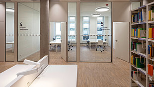 Ziel ist, ein breites und vielschichtiges Angebot an Lernorten zu schaffen. Im ersten Obergeschoss befinden sich drei Seminarräume, die in der vorlesungsfreien Zeit als zusätzliche Studienplätze an die Bibliothek angeschlossen werden können.