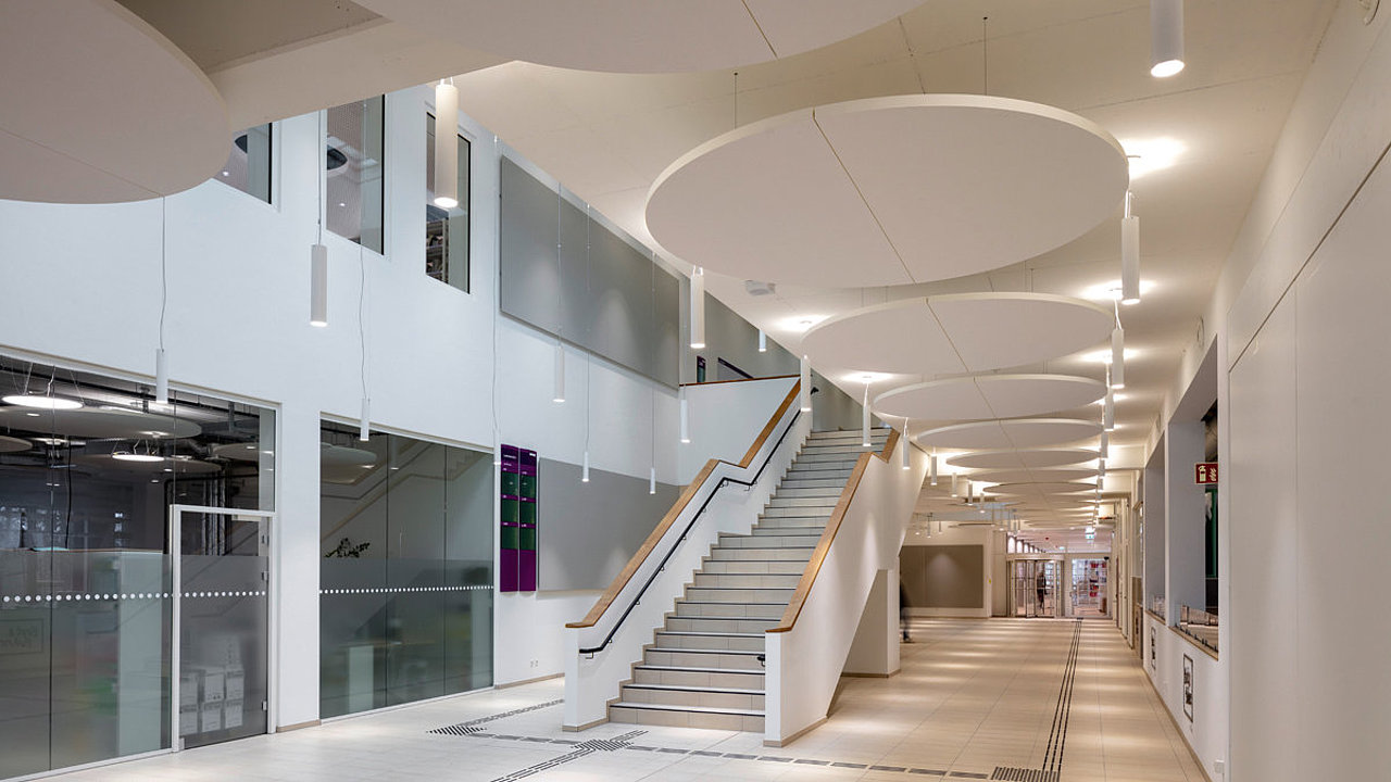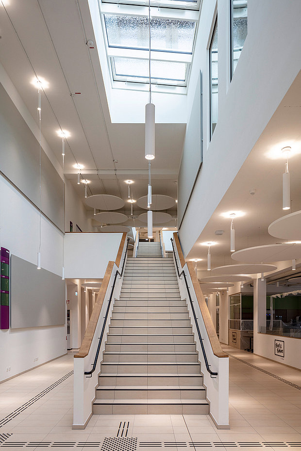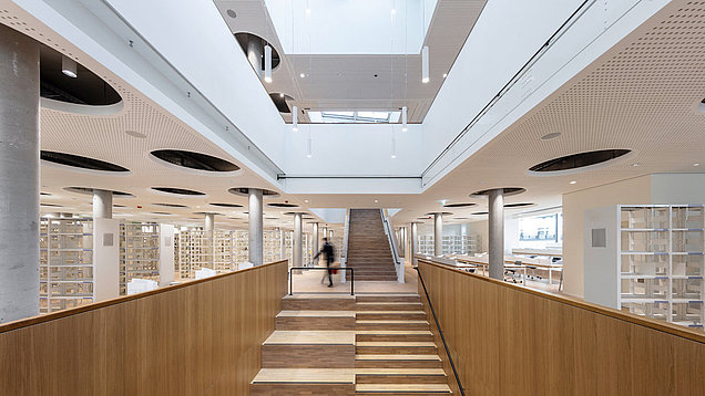 Im großzügig verglasten Foyer ist ein heller und moderner Aufenthaltsbereich mit Café, Buchladen und Fahrradservice entstanden, Oberlichter in den Flurzonen unterstützen die transparente offene Architektur. Eine Freitreppe führt vom Foyer in die oberen Geschosse, die Fachbibliothek erstreckt sich über drei Ebenen, auf denen Buchregale, Einzel- und Gruppenarbeitsplätze verteilt sind.