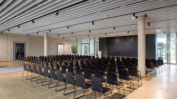 Das Herzstück ist der Neubau, der auf dem neuesten technischen Stand die Medienprozesse unterstützt. Ein multifunktionales Forum ist die Bühne für verschiedene Veranstaltungen.