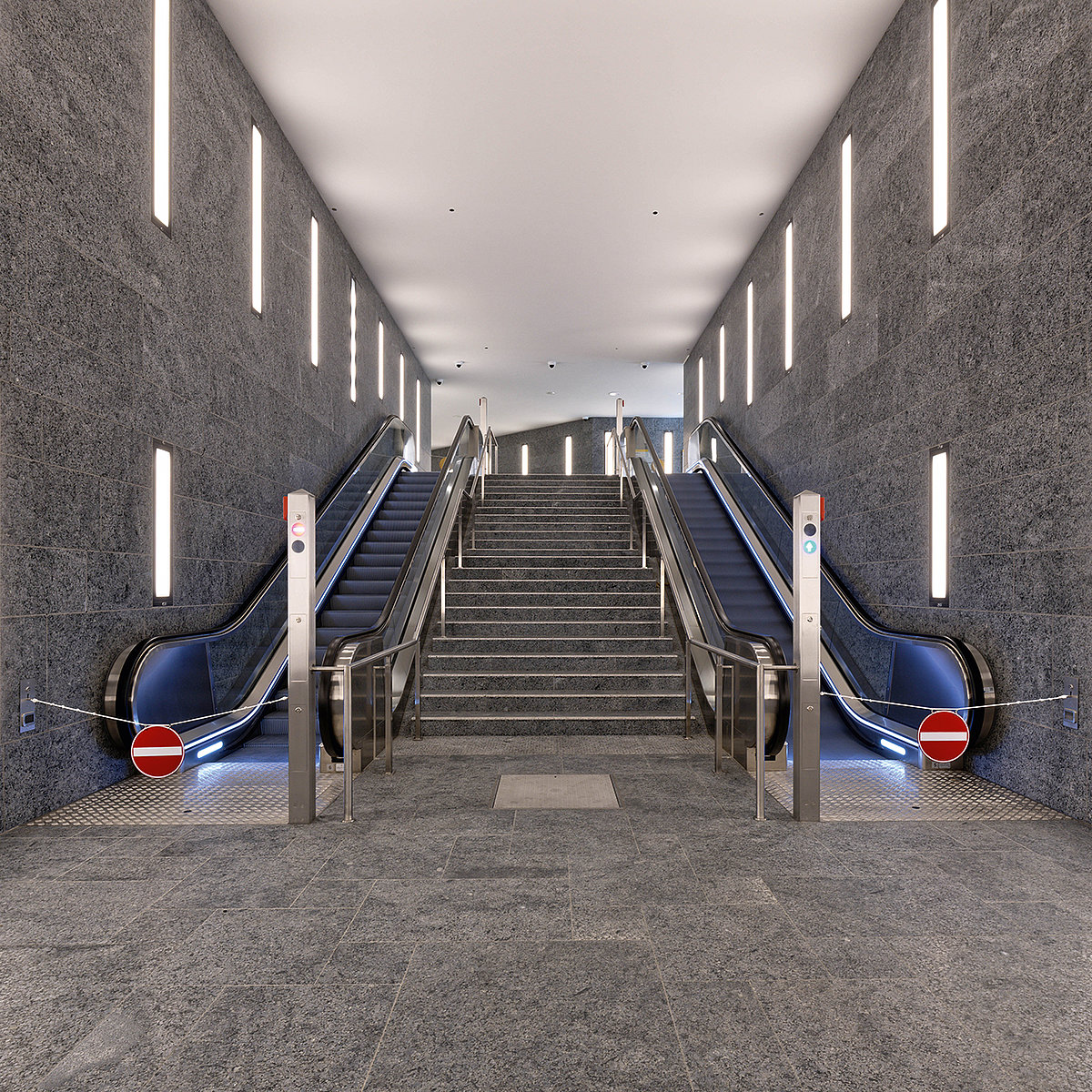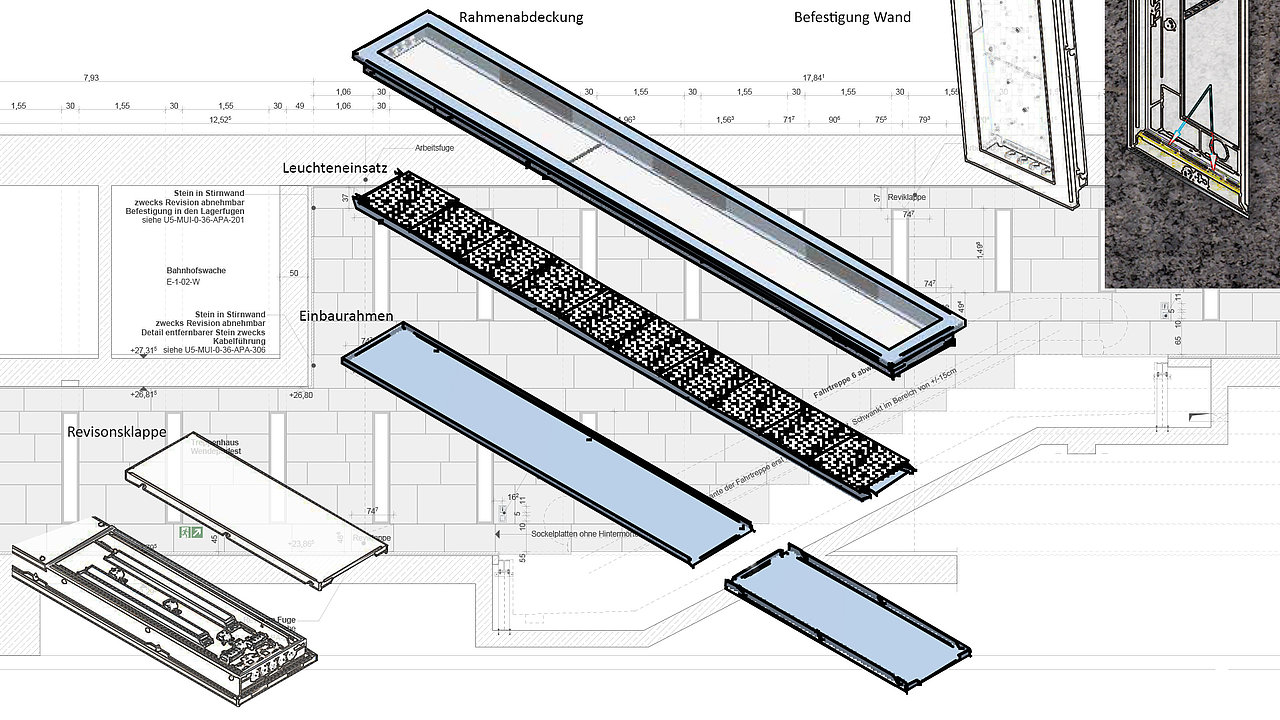 Spezielle Befestigungssystem, Leuchteneinsatz herausziehbar, Abdeckung ausschwenkbar, Revisonsöffnung durch Leuchtengehäuse, flächenbündig mit Wandverkleidung Granit; ENEC VDE zertifiziert; Gesamtschutzart IP54, CRI > 80, LED 96 Watt, Lichtfarbe 4000 K, Lebensdauer > 90.000 h