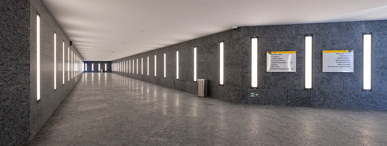 Die Gestaltung des Säulengangs ist in Anlehnung an die klassizistische Architektur der umliegenden Gebäude, geprägt von wenigen ausgewählten Materialien. Die präzise Verschmelzung der Natursteinverkleidung aus Granit und der in die Säulen fugenlos eingelassenen Beleuchtung schafft eine hochwertige, moderne Optik. Ausschlaggebende Kriterien für die Lichtlösung von SCHMITZ | WILA waren Lichtleistung, Robustheit, die gute Regulierung der Leuchtstärke (auch nachträglich), einfache und schnelle Wartung (inklusive der turnusmäßigen Prüfung des Mauerwerks hinter den Leuchten).