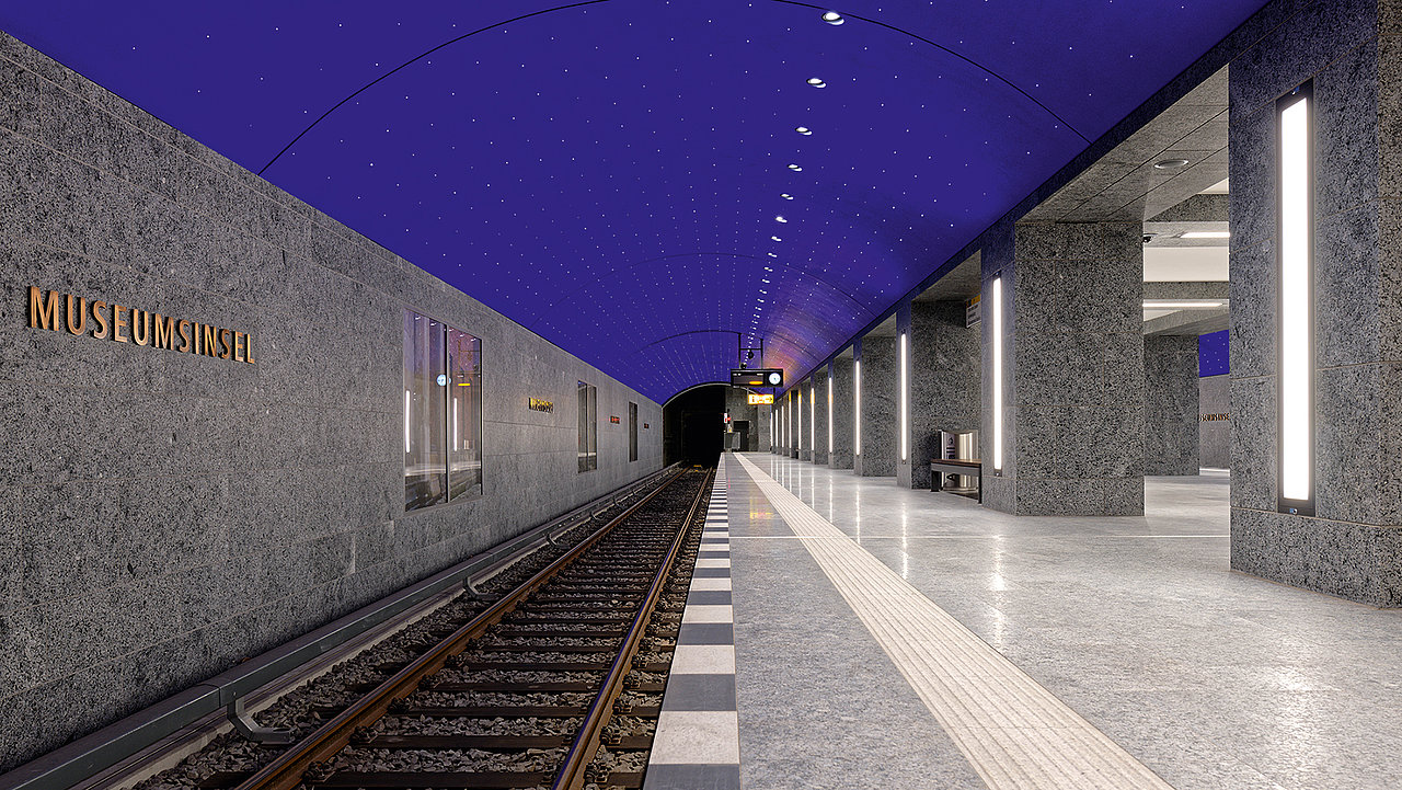Die Gestaltung von Max Dudler ist eine Hommage an Karl-Friedrich Schinkels historisches Bühnenbild aus dem Jahr 1816 für Mozarts Oper Die Zauberflöte, ein leuchtendes Ultramarinblau und 6662 Lichtpunkte lassen einen Sternenhimmel erstrahlen. Der 180 Meter lange Bahnhof verläuft südlich der Schlossbrücke unter dem Spreekanal und dient als Einstimmung auf die umlegenden bedeutendsten kulturellen Institutionen der Stadt Museumsinsel, Staatsoper, Humboldt-Forum.